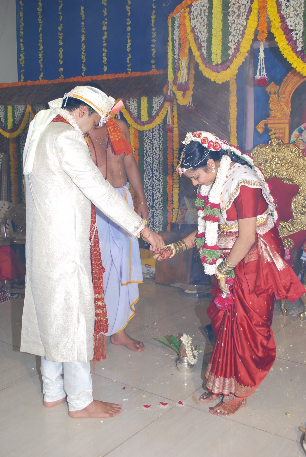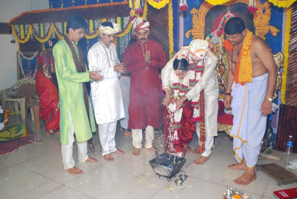 The sacred fire pit is set up in the middle of the stage, and kindled by adding puffed rice, called Laay. This is the same sacred fire which the couple later performs the Sapthapadi in the presence of. Finally, the eldest uncle of the bride presents her with two toe rings, worn on the second toe indicating the married status of the bride.