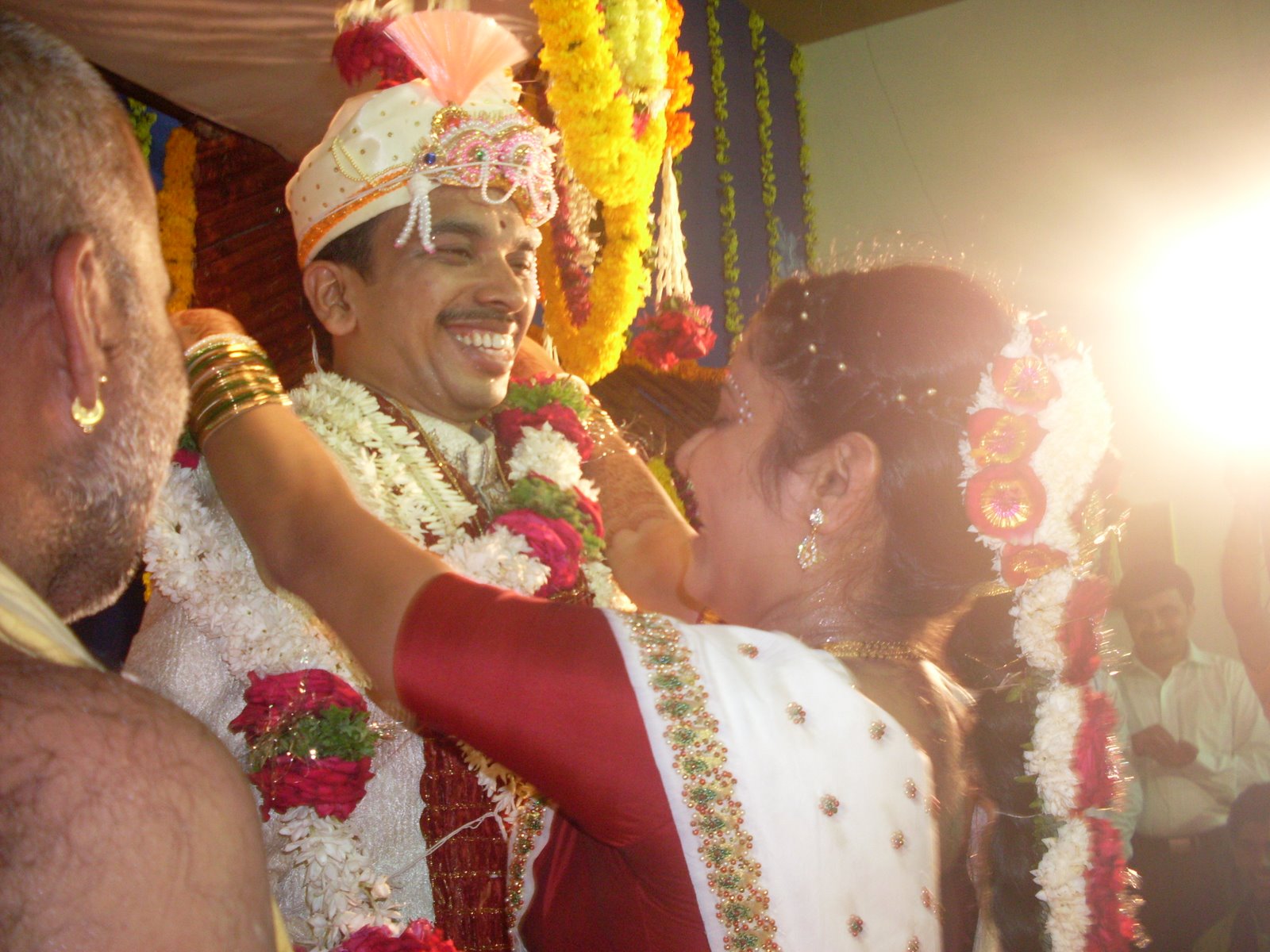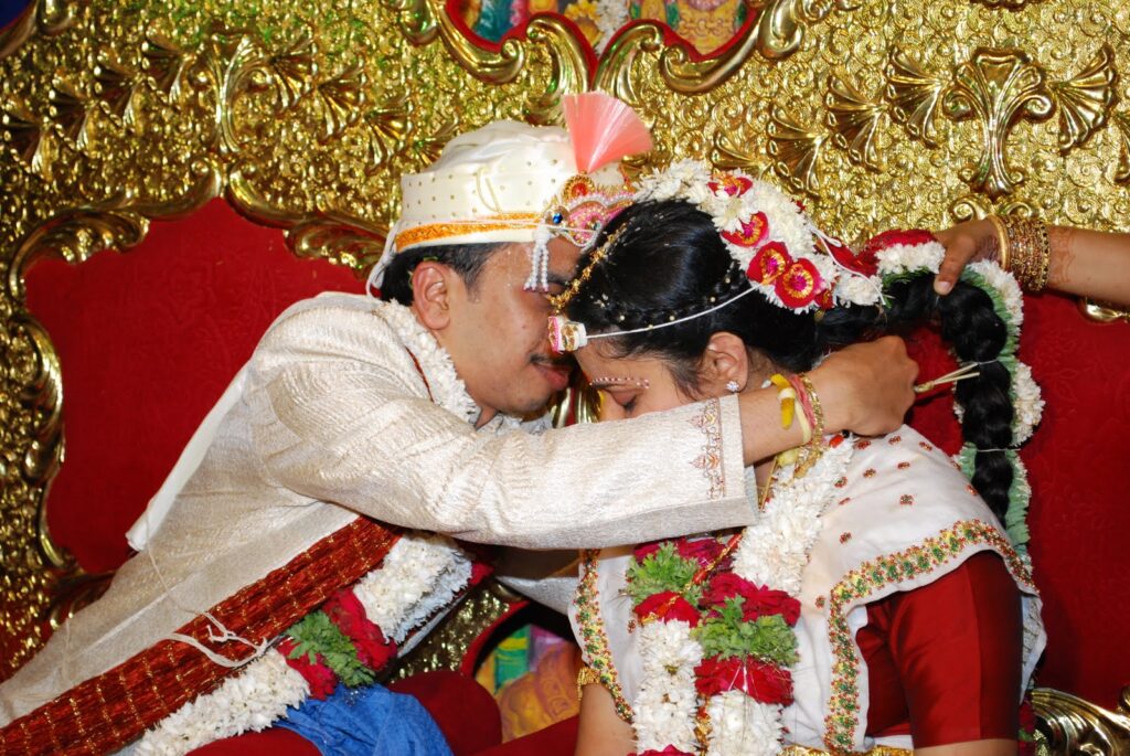 While the partition is still up between the couple, the priest chants prayers and talks about the significance of marriage and married life. He then offers his blessings, and the partition between the couple is removed. The bride and groom then put the flower garlands around each other’s necks, and occasionally, the bride or groom is lifted up, so that putting the garland on is harder for the other spouse (the groom is being lifted up in this photo, so it is harder for the bride to put the garland on ☺︎)