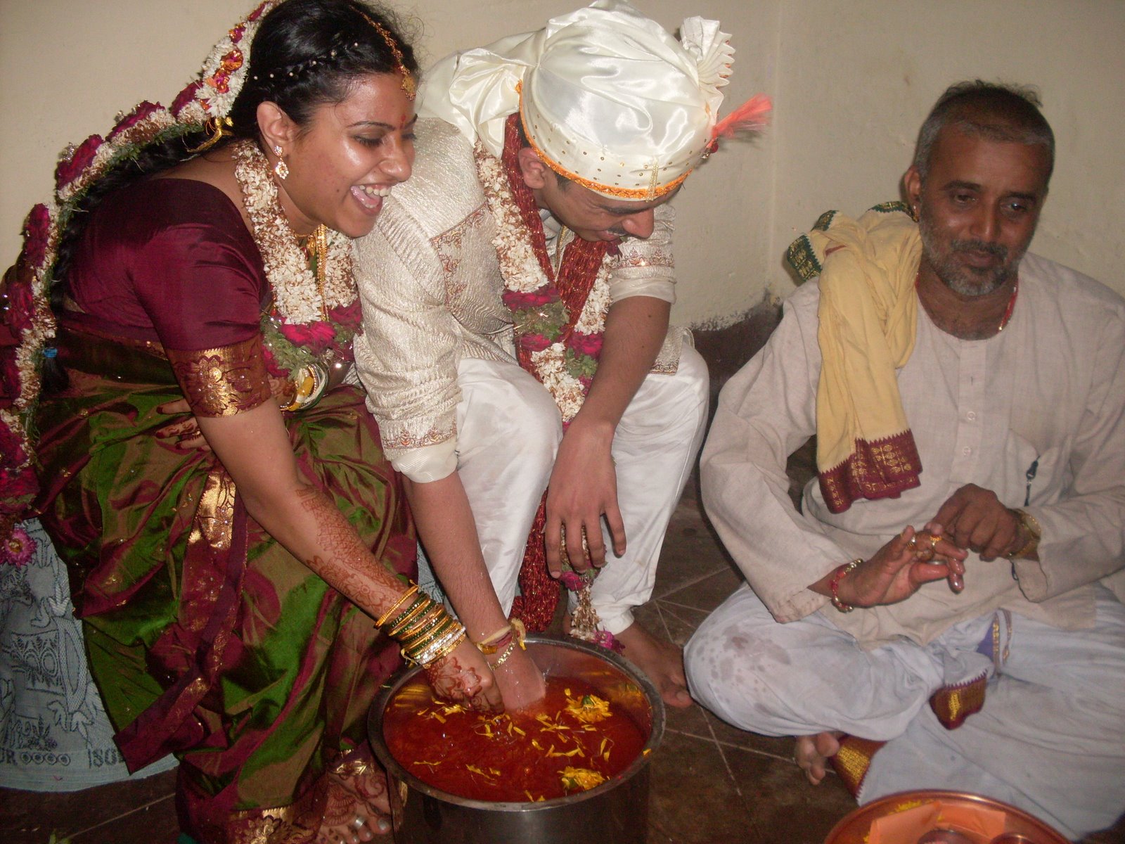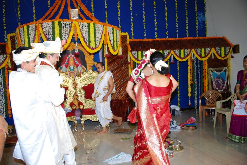 For this tradition, the father of the bride walks the groom down the aisle, and the priest holds a silk cloth (the partition) in front of the groom, so that the couple cannot see each other, as they are only supposed to see each other during the time of the ceremony. The maternal uncle of the bride brings the bride down the aisle, and both the bride and the groom carry flower garlands.