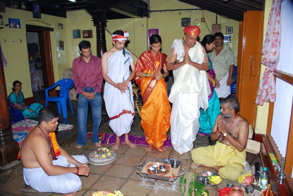 The Prarthana is a small puja that is done before the start of all the wedding rituals, that is done seperately by the bride and the groom at their respective homes.