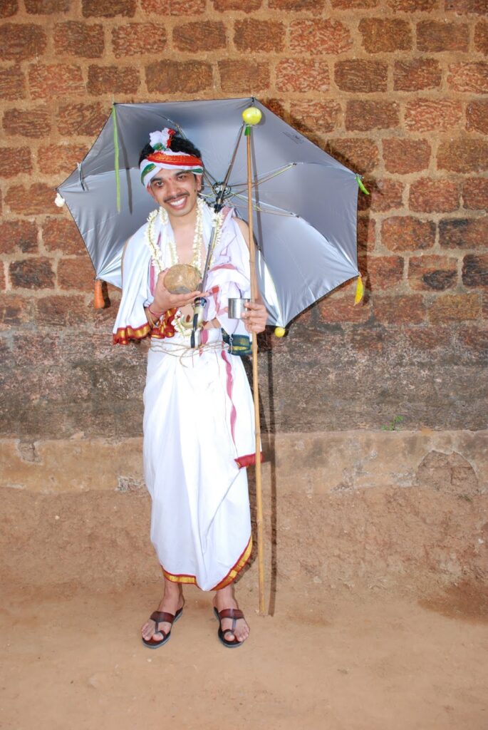 The Kashi Yatra is a playful, yet important custom done during or before the wedding, where the husband takes an umbrella, sandals and a small pot, saying that he is going to become a pilgrim and go for a pilgrimage to Kashi. He says that he is going to live the life of a monk, and the bride’s father then states that he cannot go and tells him to come and marry his daughter instead, convincing him of the “merits of matrimony. The groom then takes God’s blessings and decides to get married. It is done as a sweet reminder that the couple will now go on their spiritual journey in unity, and that they will go through matrimony and life together. It also shows how even the most educated will have to find a balance between their married life and their spirituality.