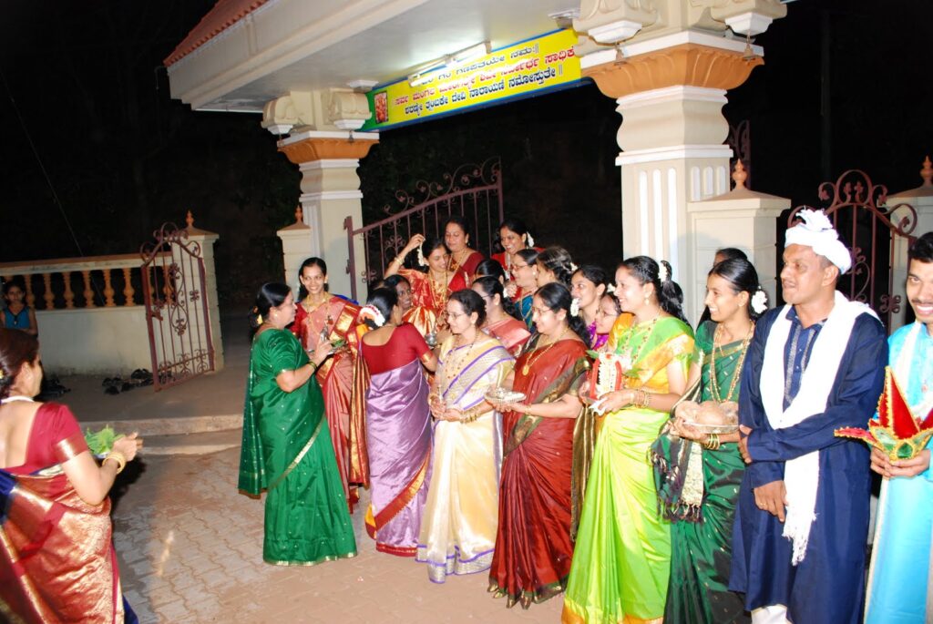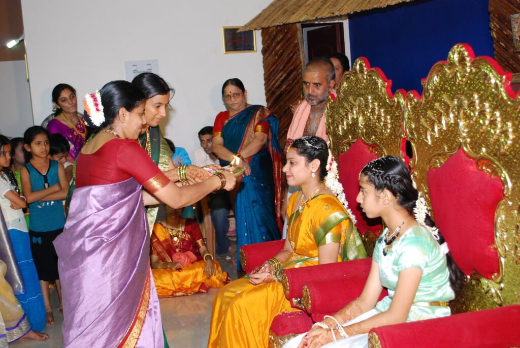 In the GSB wedding tradition, the wife is given a new name after her marriage, and this puja is hence conducted to honor the courage of the bride as she takes her new name, and to honor the daughters who underwent this change before them (the name is symbolic, and the wife can opt to still be called by her normal name). All of the married sisters and cousins are called on the stage and are given gifts by the parents of the bride.